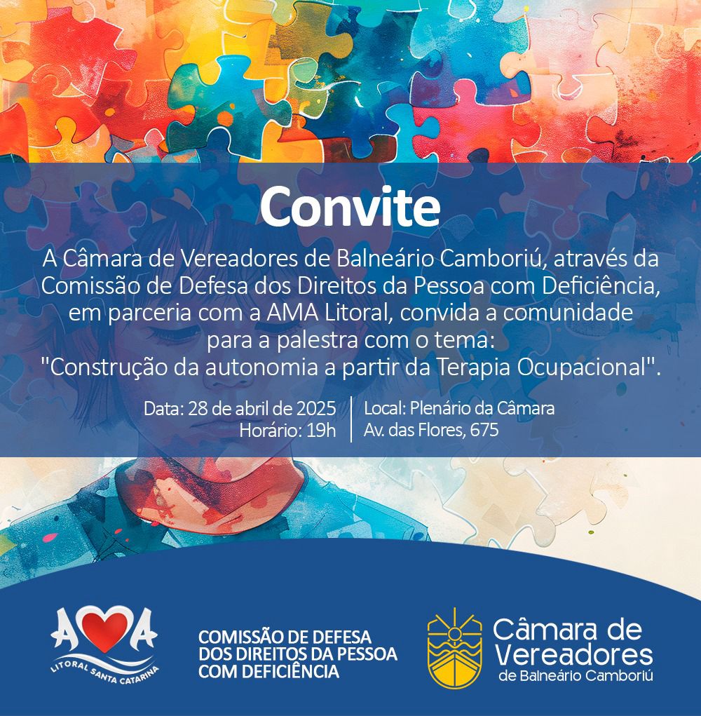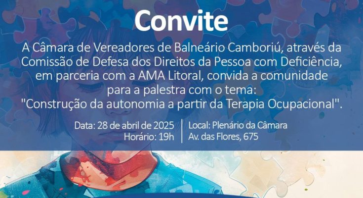 A Comissão de Defesa dos Direitos da Pessoa com Deficiência (CDDPD) da Câmara de Vereadores de Balneário Camboriú realizará, no dia 28 de abril, próxima segunda-feira, a palestra “Construção da Autonomia a partir da Terapia Ocupacional”, em parceria com a AMA Litoral (Associação dos Pais e Amigos do Autista do Litoral de Santa Catarina).