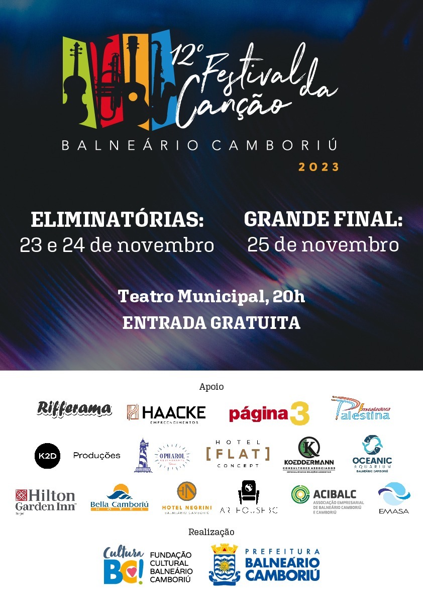 Um dos mais tradicionais eventos de música de Santa Catarina começa nesta quinta-feira (23 de novembro), às 20h, no Teatro Municipal Bruno Nitz. É o 12º Festival da Canção de Balneário Camboriú, que vai até sábado (25), sempre no mesmo horário e com entrada gratuita.