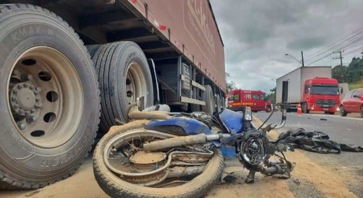 O condutor da moto foi socorrido pelos bombeiros voluntários com politraumatismo e sem os sinais vitais.