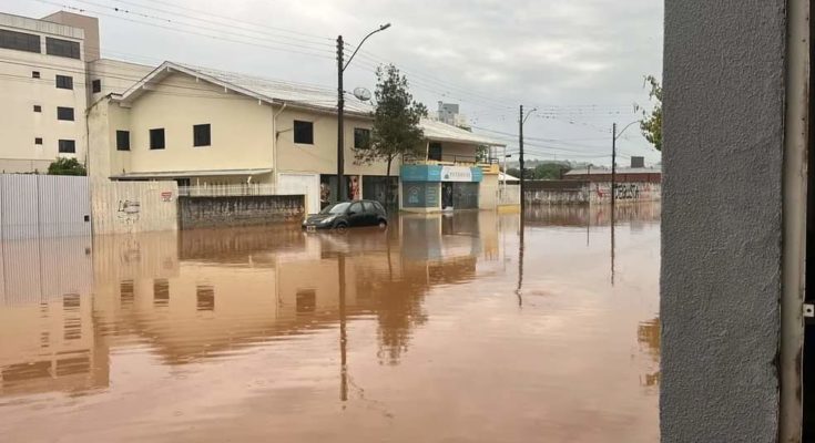 Xanxerê, no Oeste de Santa Catarina, amanheceu nesta quinta-feira (19) com diversas ruas alagadas após o rio que corta a cidade transbordar por conta da chuva volumosa que atinge a região.