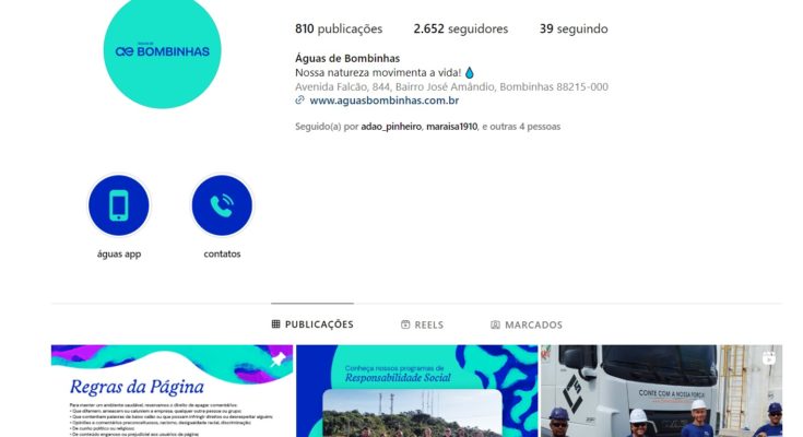 As redes sociais desempenham um papel fundamental na comunicação de diversas empresas. Com a Águas de Bombinhas, não seria diferente. É uma plataforma eficaz para comunicação direta com os clientes. Através delas, é possível disseminar informações importantes sobre o serviço como manutenções programadas e dicas de economia de água de forma rápida e abrangente, alcançando um grande número de pessoas em tempo real.