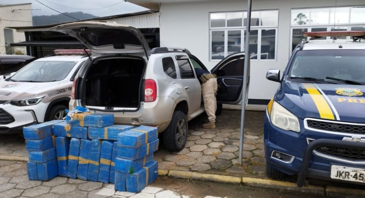 Dentro do porta-malas e banco traseiro de um Renault/Duster placas de Içara/SC os agentes encontraram 308,9 quilos da droga. O motorista, de 24 anos, foi detido e conduzido à Delegacia de Polícia de Grão-Pará.