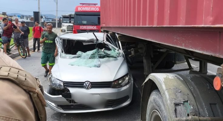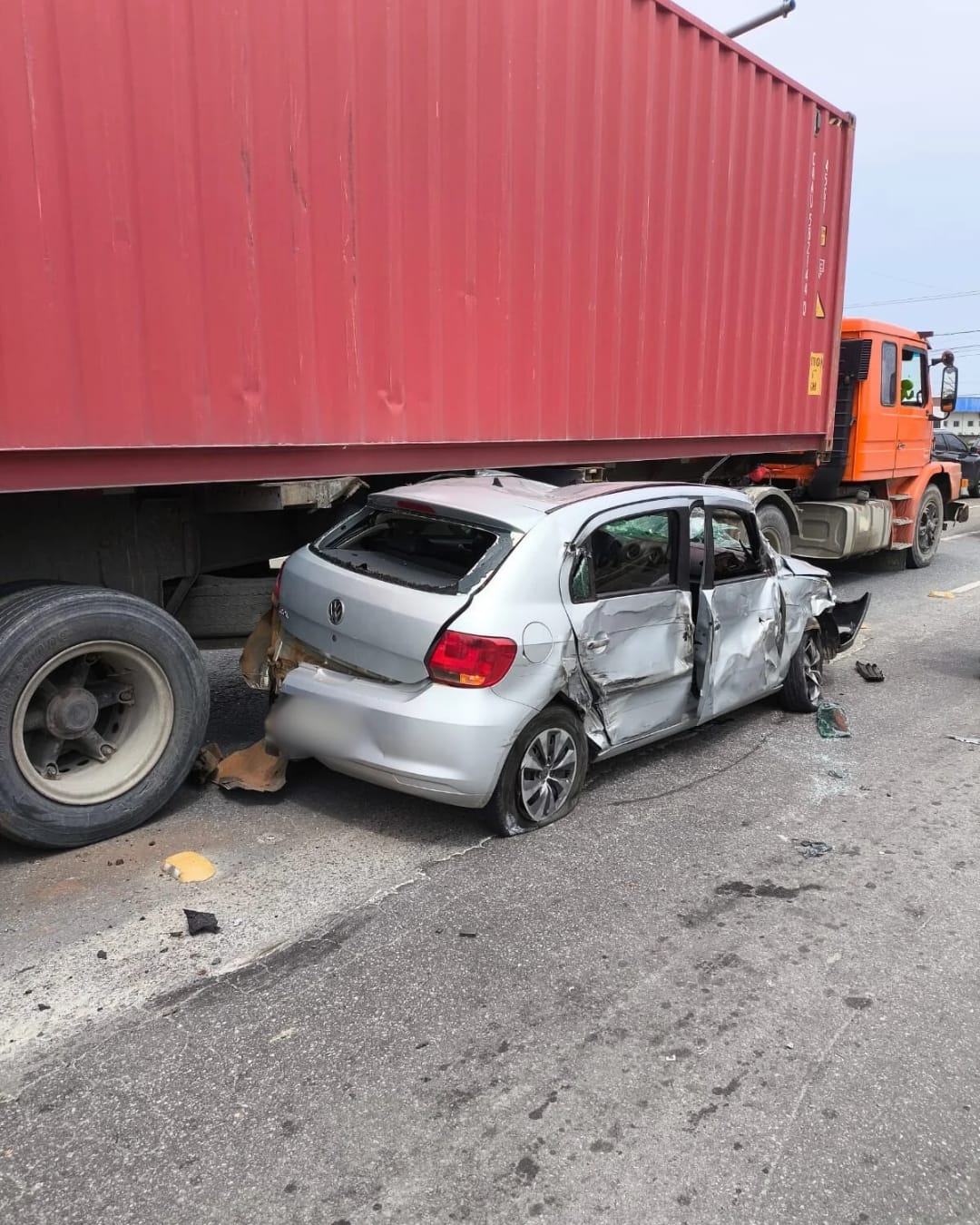 Na tarde desta sexta-feira, 7, por volta das 14h, o Corpo de Bombeiros Militar de Navegantes foi acionado para atender a um grave acidente de trânsito na entrada do bairro São Domingos. No local, os bombeiros encontraram um veículo Volkswagen Gol, oriundo de Bandeirantes-PR, preso entre duas carretas em uma colisão impactante.