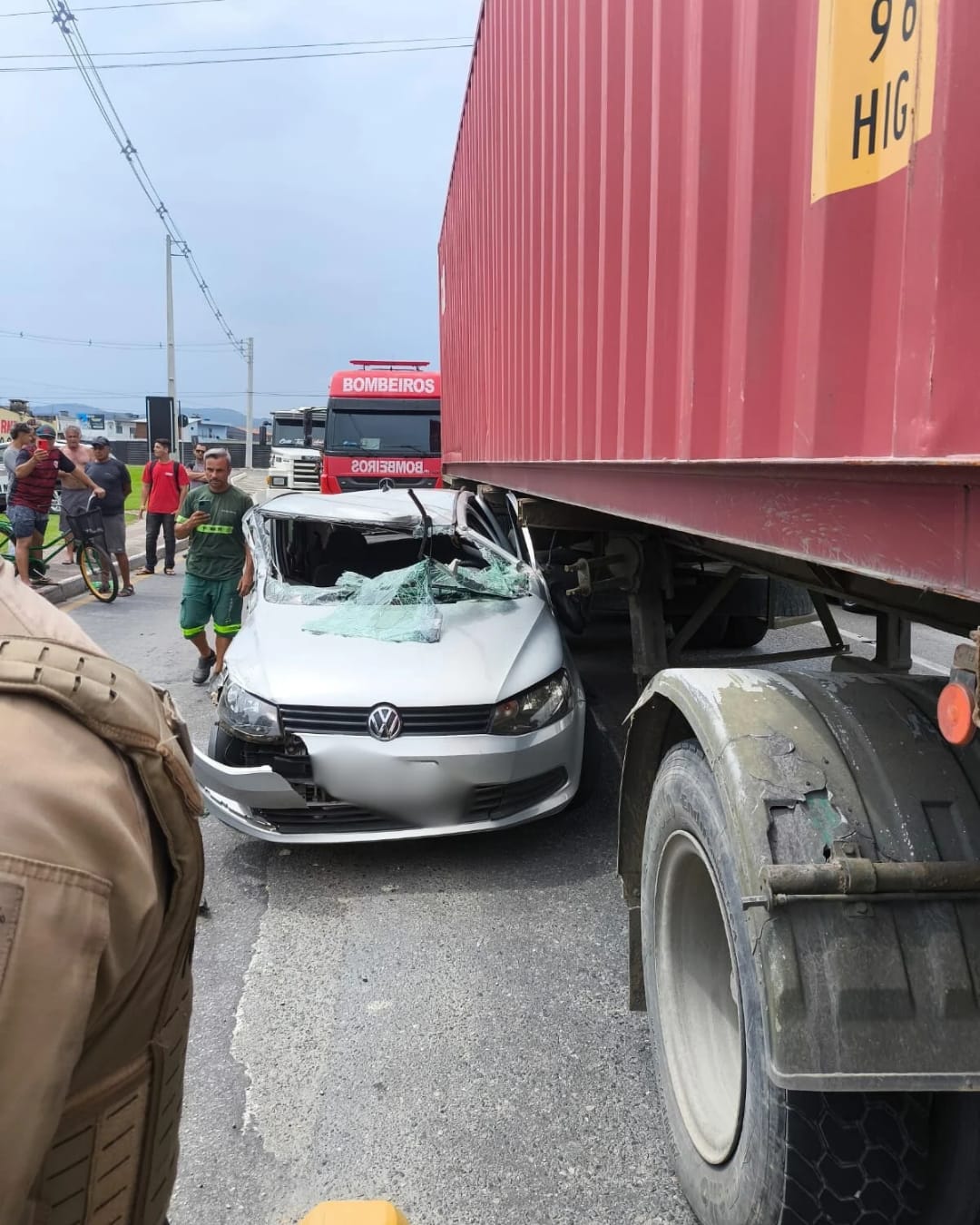 Na tarde desta sexta-feira, 7, por volta das 14h, o Corpo de Bombeiros Militar de Navegantes foi acionado para atender a um grave acidente de trânsito na entrada do bairro São Domingos. No local, os bombeiros encontraram um veículo Volkswagen Gol, oriundo de Bandeirantes-PR, preso entre duas carretas em uma colisão impactante.