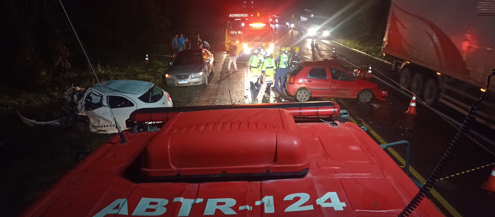 Ao chegar no local os bombeiros, confirmaram as informações transmitidas pelo COBOM e três carros foram encontrados na cena: um FIAT Palio vermelho, um GM Onix Branco e um Hyundai Azera prata.