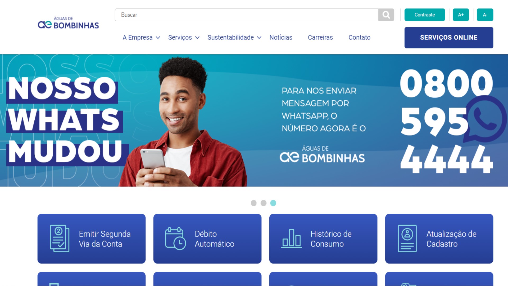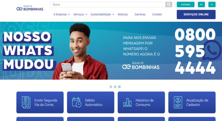 A solicitação pelo WhatsApp pode ser feita das 7h às 21ho com envio de mensagem para (47) 0800 595 4444. Pelo site da concessionária (www.aguabombinhas.com.br), é só clicar em serviços online e escolher a opção 2ª via. Apenas no primeiro acesso à Agência Virtual, o cliente faz um pequeno cadastro, depois consegue acessar para este e vários outros serviços com seu número de matrícula e CPF.