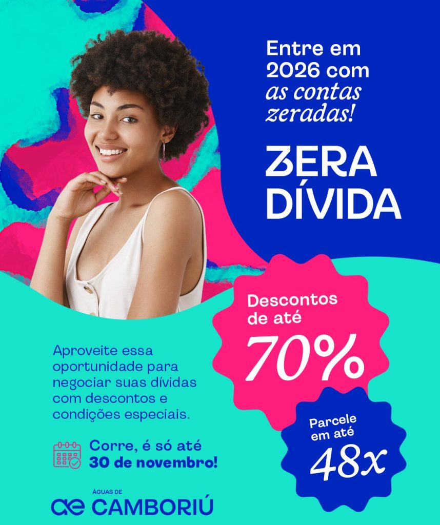 A Águas de Camboriú, empresa pertencente à AEGEA SC, realiza até 30 de novembro a campanha “Zera Dívida”, uma ação especial de negociação que oferece descontos de até 70% sobre o valor total de débitos e condições de parcelamento em até 48 vezes.