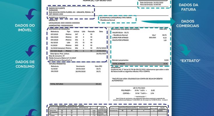 - Extrato: este espaço contempla a descrição do faturamento do imóvel e apresenta dados relacionados aos valores, como possíveis juros, multas, metragem cúbica consumida, etc.