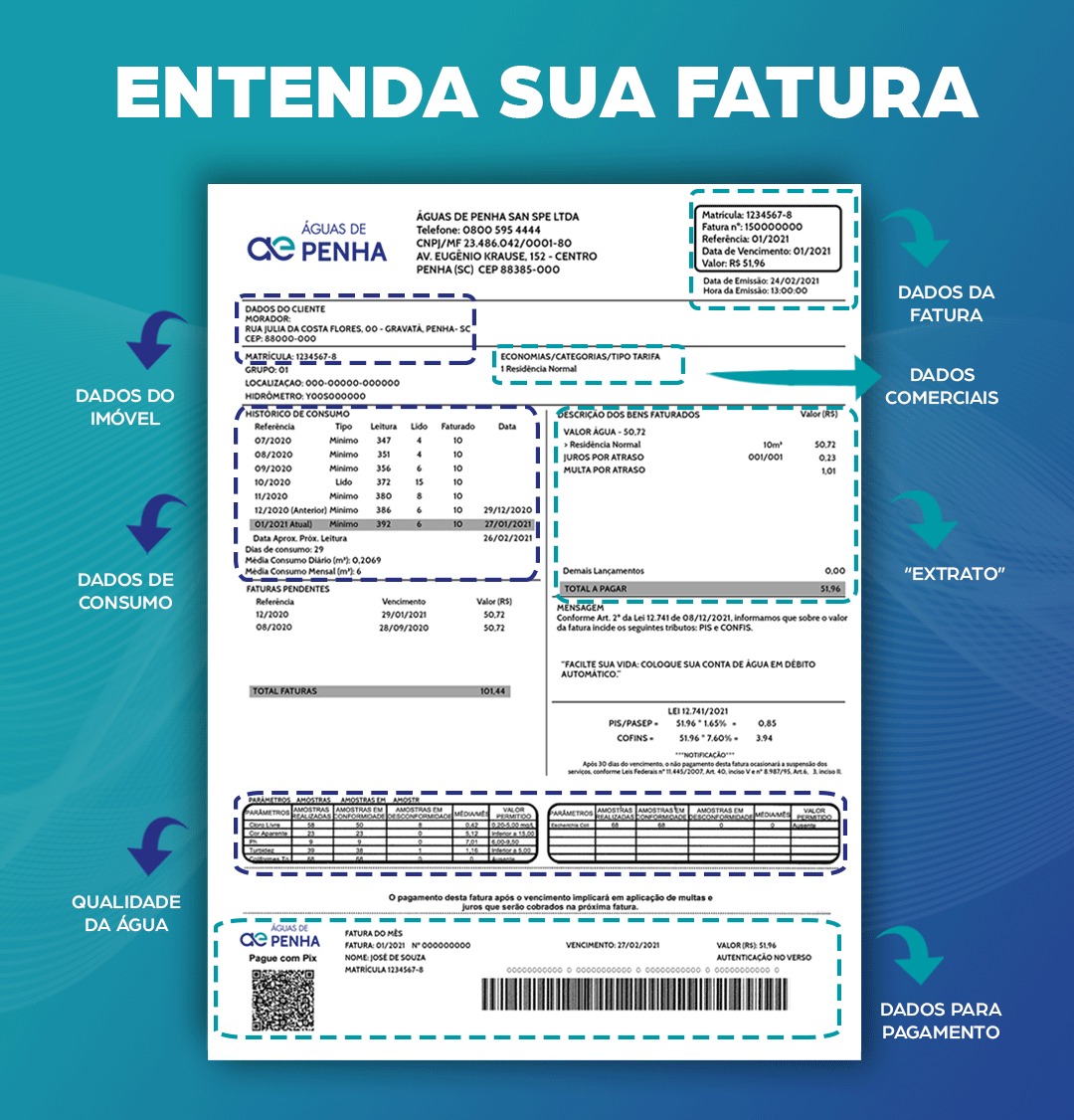 Você já parou para observar quantas informações são repassadas na fatura de água? Todos os meses a Águas de Penha te atualiza com dados importantes como o consumo mensal, informações sobre o imóvel, as formas de pagamento e extrato da conta. Quer aprender mais? Confira abaixo cada tópico da fatura: