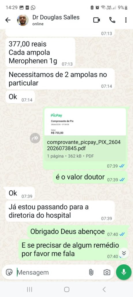 Balneário Camboriú – Um golpe cruel abala famílias de pacientes em Santa Catarina. O Portal Janelão recebeu denúncia de uma senhora que, às 6h da manhã deste domingo (26), recebeu ligação desesperadora: seu marido estaria em estado grave no Hospital Regional Ruth Cardoso, precisando urgentemente de um remédio manipulado chamado “Meropheben 1g” – duas ampolas a R$ 377 cada, totalizando R$ 755.