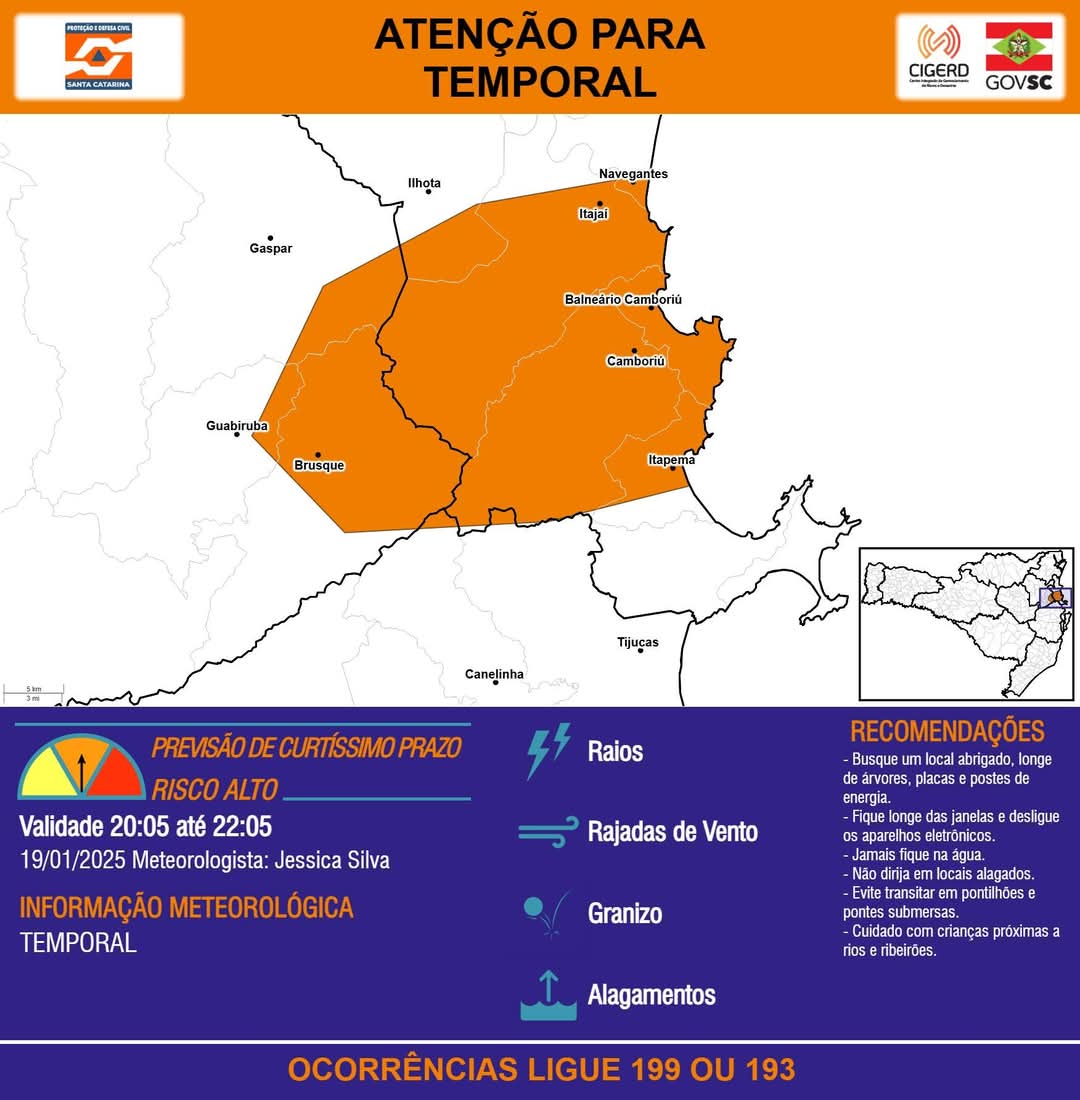 As cidades de Balneário Camboriú, Brusque, Camboriú, Canelinha, Gaspar, Guabiruba, Ilhota, Itajaí, Itapema, Navegantes e Tijucas estão sob alerta para um forte temporal nas próximas duas horas. A previsão indica a ocorrência de raios intensos, rajadas de vento que podem ultrapassar os 70 km/h, granizo e alagamentos em várias áreas.