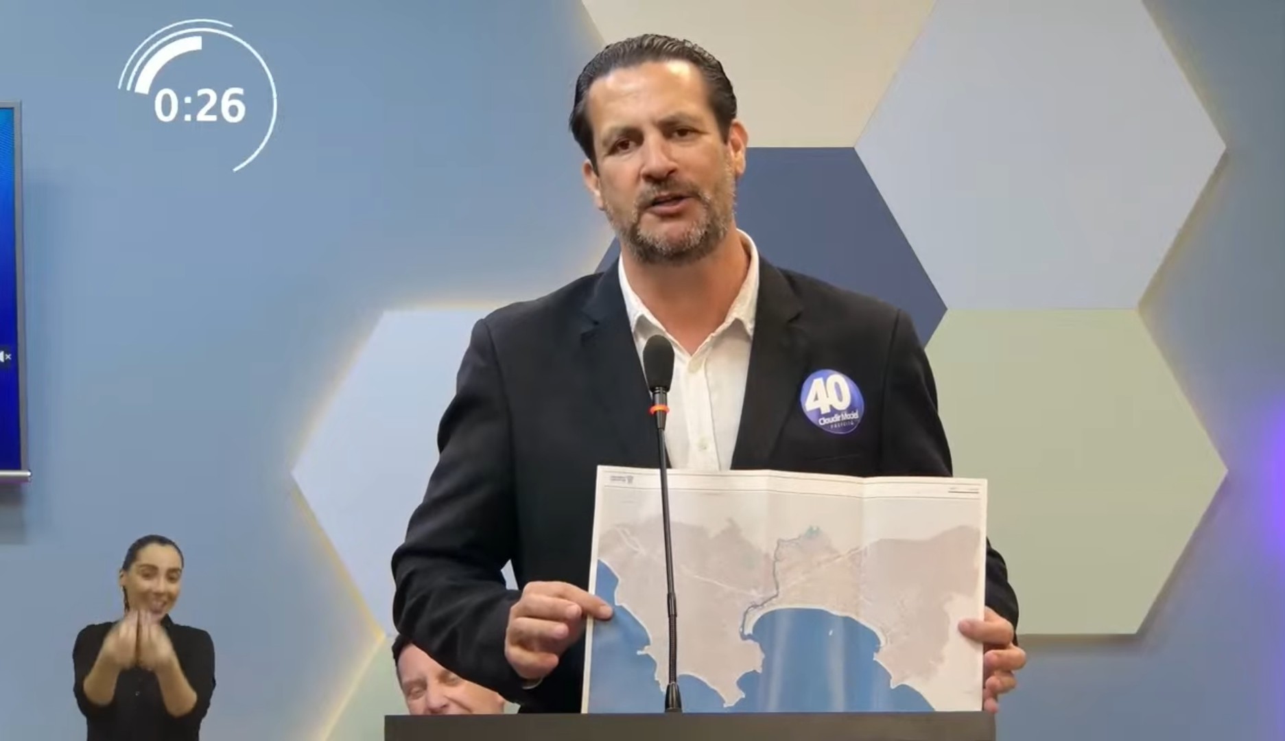 Claudir Maciel, ex-vereador por quatro mandatos, trouxe um mapa da cidade e fez uma provocação ao candidato Peeter: