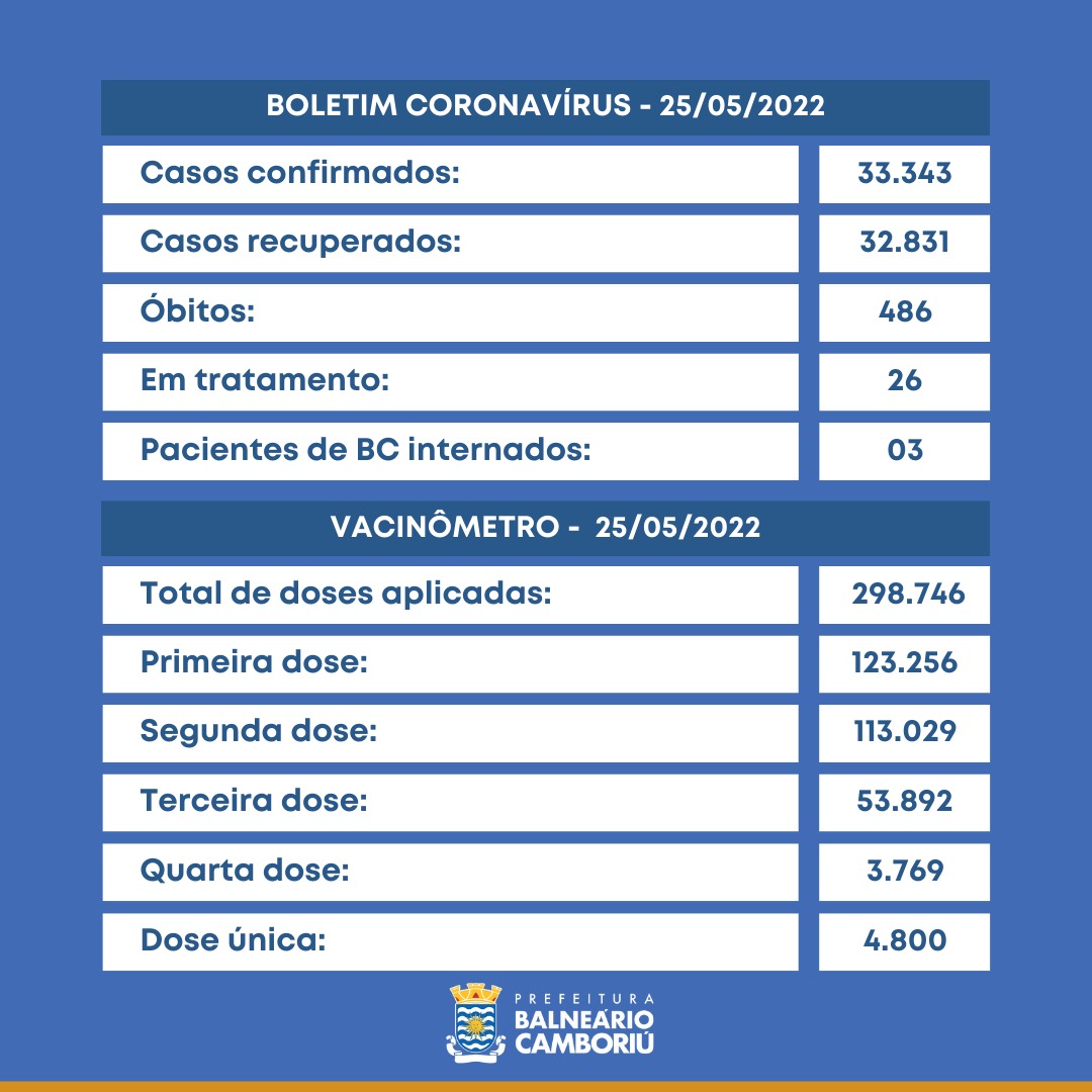 Nesta quarta-feira (25), Balneário Camboriú registrou 8 novos casos confirmados de Coronavírus. O município chega a 33.343 casos, sendo que 32.831 destes (98,4%) já estão recuperados e receberam alta. Permanecem em tratamento 26 pacientes, sendo 23 em domicílio e três internados.