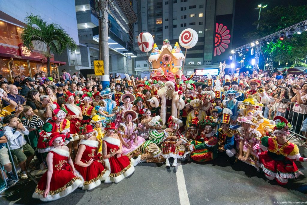 A apresentação “Simplesmente Natal” celebrou a magia e o espírito natalino com música ao vivo, dança, teatro e acrobacias. No total 15 artistas, entre músicos e bailarinos, envolveram os presentes, que também puderam apreciar três dos carros alegóricos – estacionados ao lado da Praça Almirante Tamandaré. Eles serão utilizados nos desfiles que percorrerão toda a orla da Praia Central.