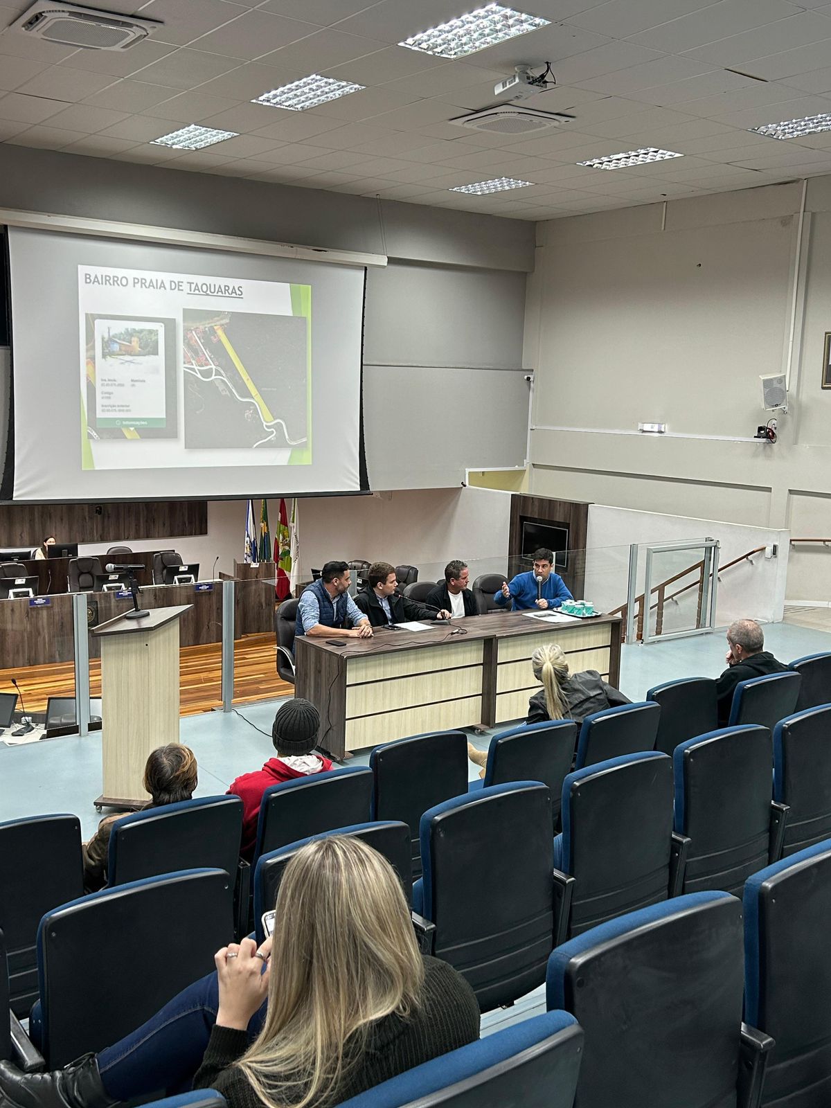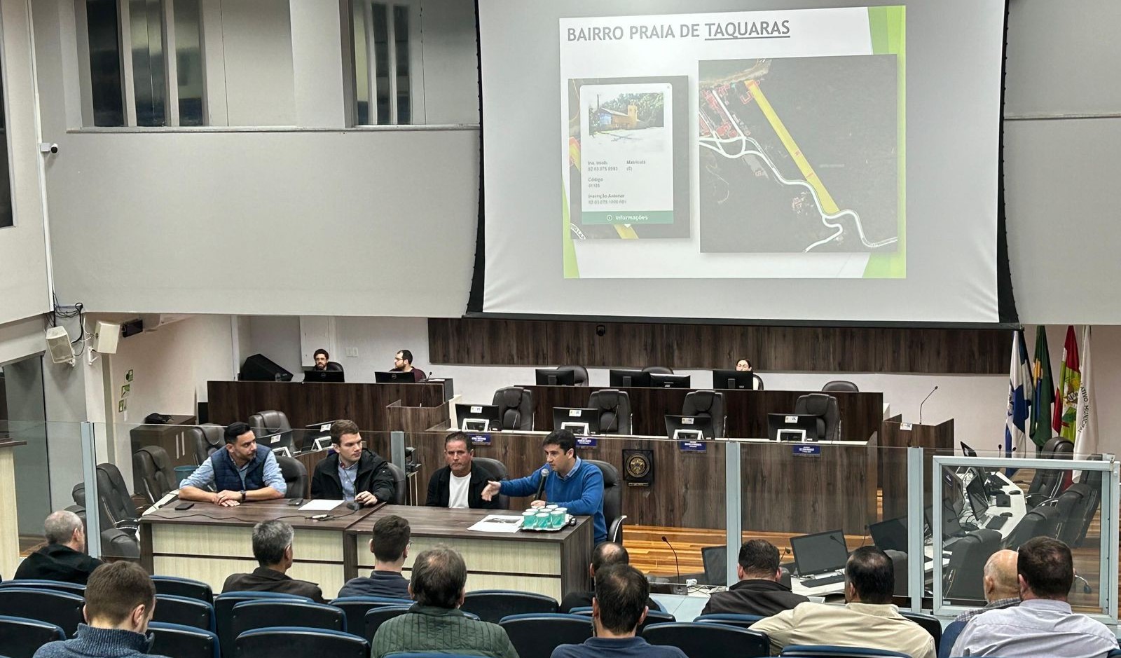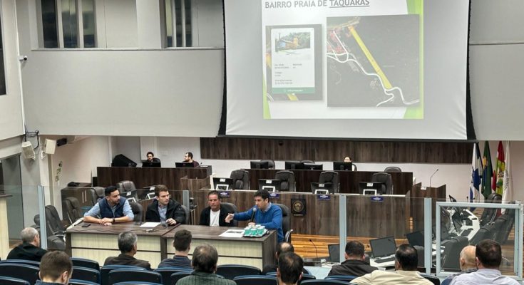 A Câmara de Vereadores de Balneário Camboriú recebeu nesta segunda-feira (24) a audiência pública que discutiu a criação de quatro novos bairros na cidade. A reunião foi conduzida pela Comissão de Justiça e Redação após o vereador André Meirinho (PP) protocolar o projeto de lei nº 48/2024, que divide a área onde está localizada a Região das Praias e cria os Bairros de Laranjeiras, Taquaras, Estaleiro e do Estaleirinho.
