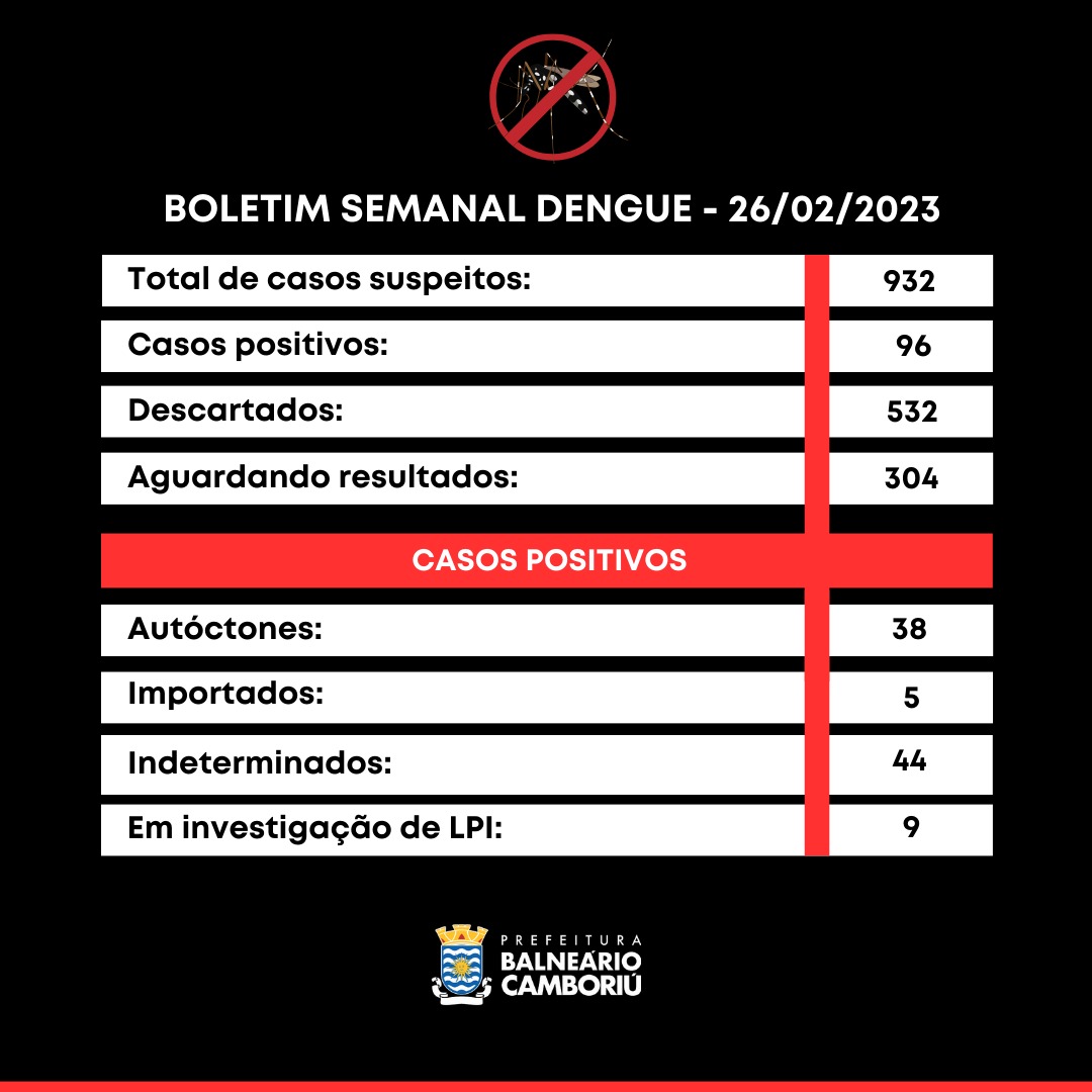 A prefeitura de Balneário Camboriú, por meio da Secretaria de Saúde, atualiza os números da dengue em seu mais recente boletim epidemiológico. Os dados acumulados desde o início do ano apontam que, até a última sexta-feira (23), foram notificados 932 casos suspeitos, dos quais 96 tiveram o diagnóstico confirmado da doença. Dentre esses casos, 532 análises foram descartadas, enquanto outros 304 exames aguardam resultado.
