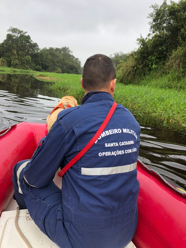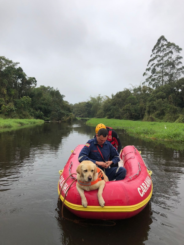 Já no período da tarde, a cadela Moana esteve acompanhando a equipe sobre o bote nas buscas, que seguiram junto com o jet-ski no rio por cerca de 7 km no sentido Norte, a partir do ponto em prosseguiram à remo.