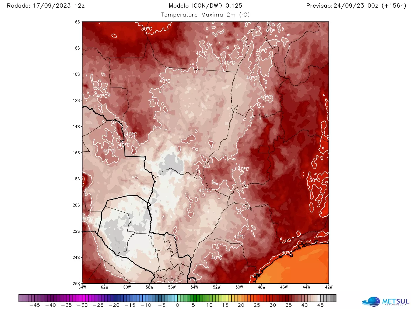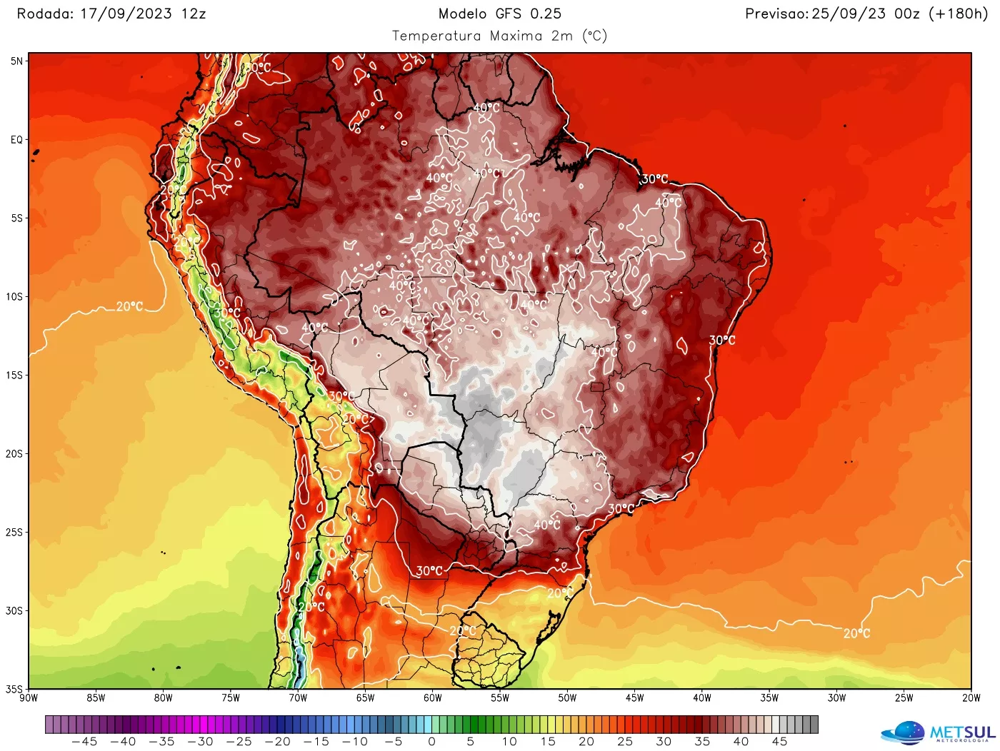 Uma massa de ar extremamente quente vai cobrir o Brasil nos próximos dias. Já faz muito calor neste começo de semana no Centro-Oeste e no Sudeste, mas na segunda metade da semana a massa de ar se reforça ainda mais com temperatura atipicamente elevadas, mesmo calor intenso não sendo incomum nestas áreas do território nacional no mês de setembro. Trata-se de uma situação de elevado perigo pela severidade do calor esperado e que demandará atenção das autoridades. Serão vários estados em que o calor será muito intenso a extremo. A massa de ar quente vai afetar com força e marcas perto ou acima de 40ºC, por exemplo, o Paraná, Mato Grosso do Sul, São Paulo, Mato Grosso, Rio de Janeiro, Minas Gerais, Goiás, Distrito Federal, Rondônia, Amazonas, Pará, Tocantins, Bahia, Piauí e Maranhão.