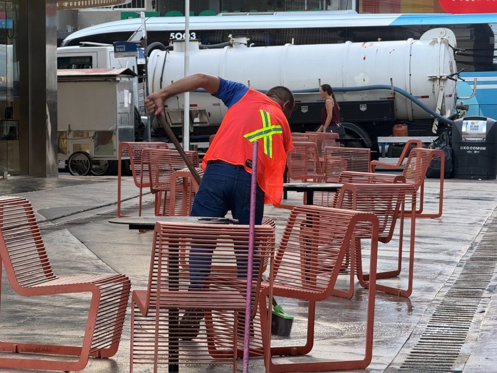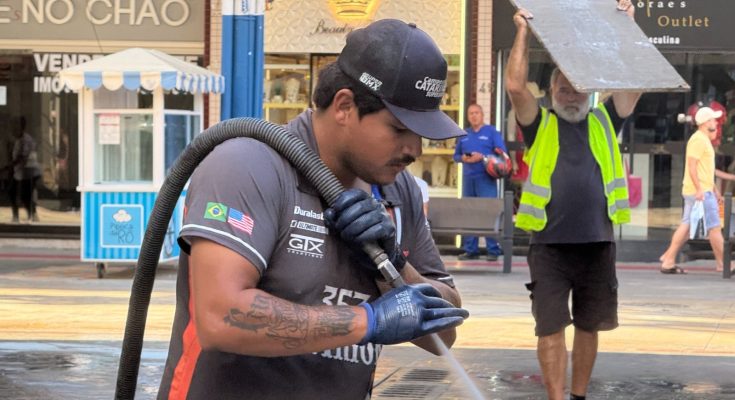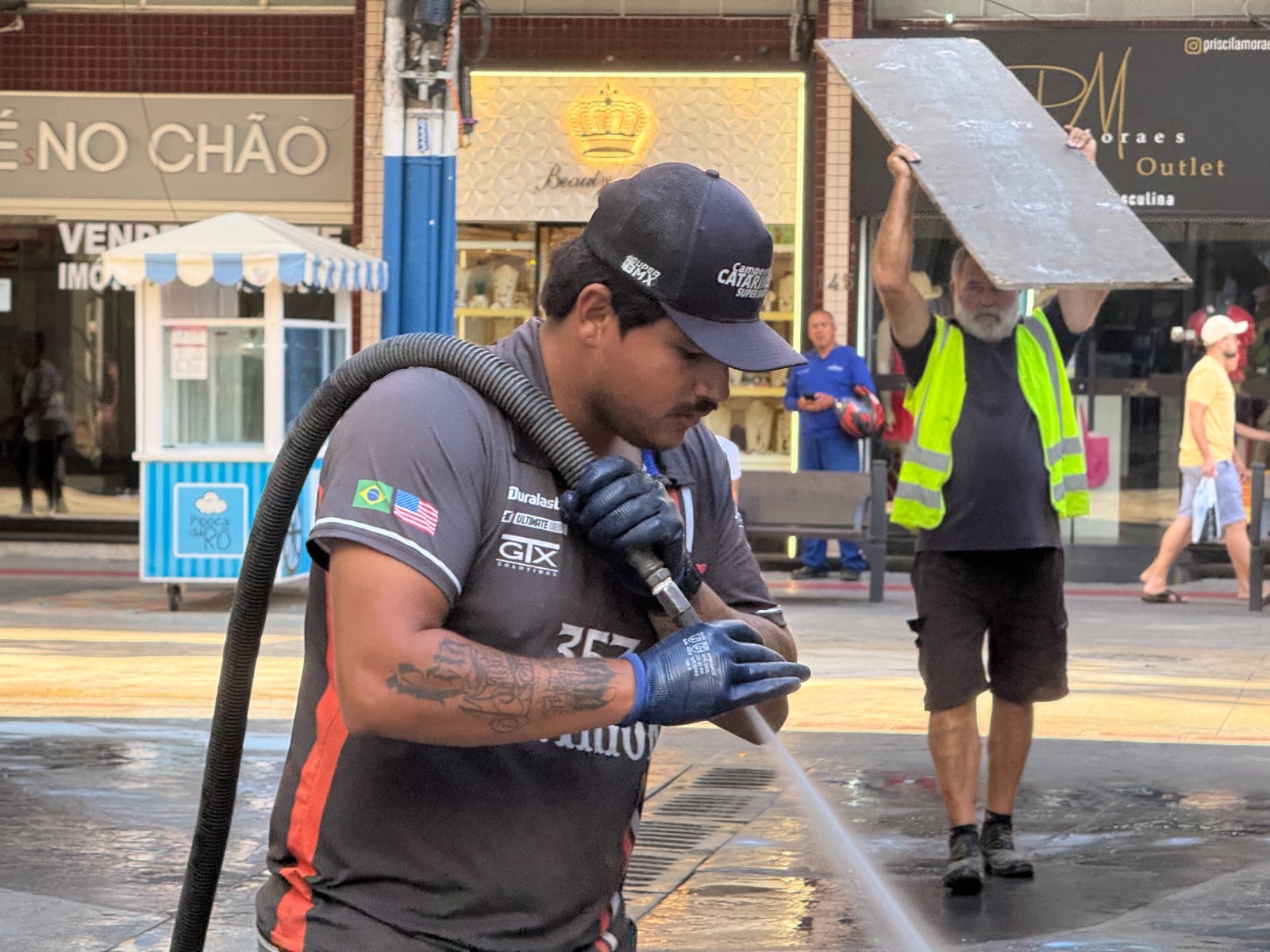 A limpeza foi outro destaque da ação. As equipes realizaram a desobstrução e higienização de bocas de lobo e tubulações, além da lavagem completa do calçadão com uso de sabão e detergente.