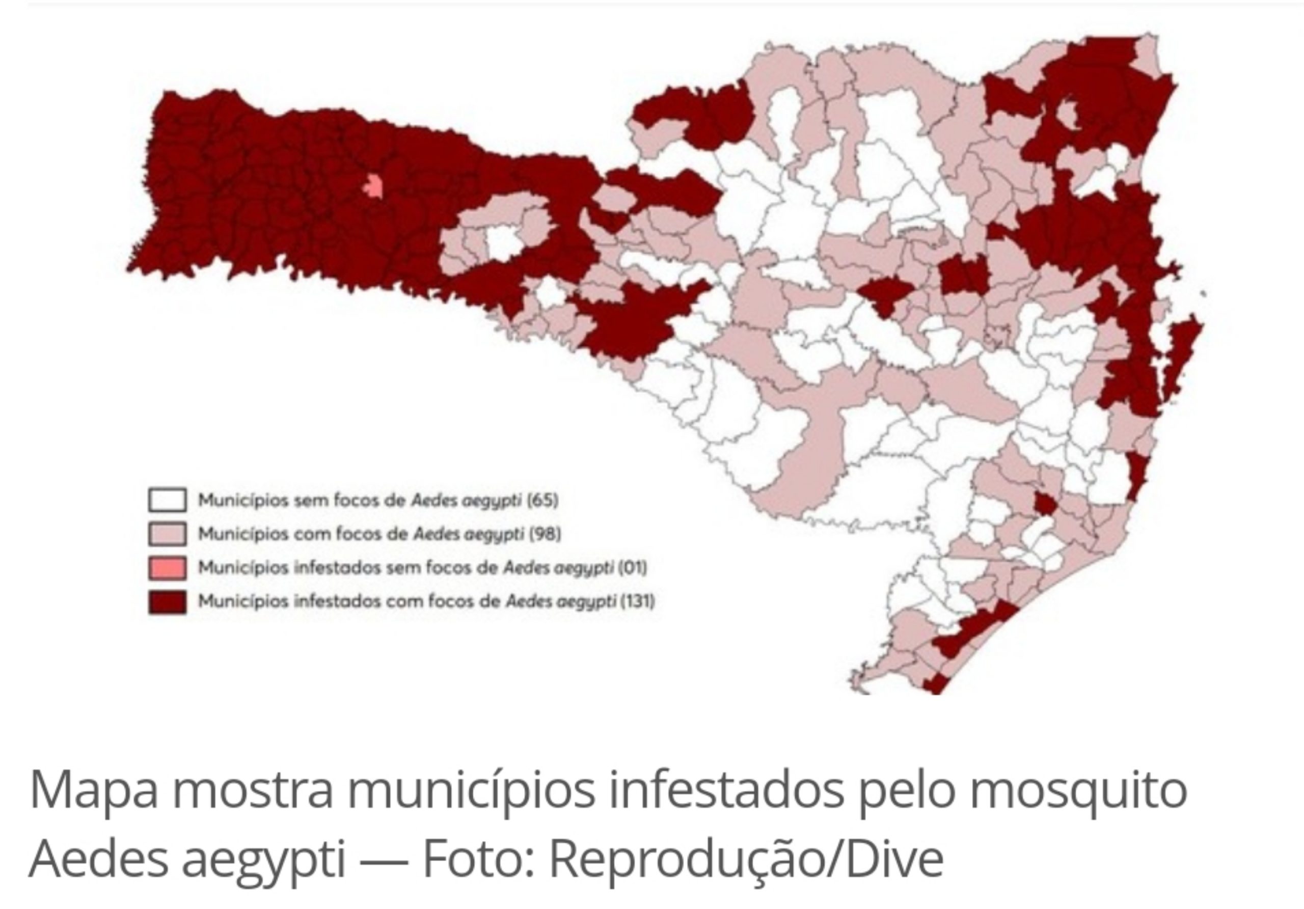 Em Julho Santa Catarina, tinha 70 municípios em nível epidêmico da dengue. A Organização Mundial da Saúde (OMS) define o nível de transmissão epidêmico quando a taxa de incidência é maior de 300 casos de dengue por 100 mil habitantes.