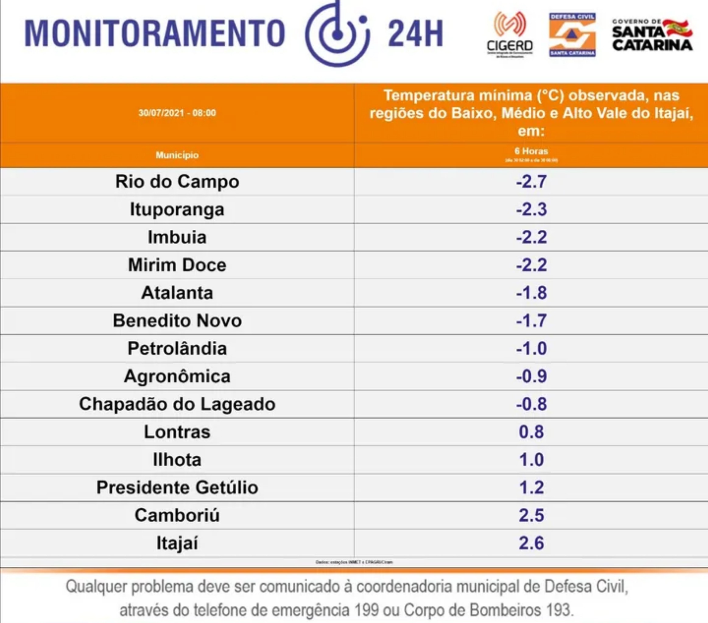 Frio extremo e geada ampla, toma conta de Santa Catarina: Camboriú chegou marcar 2,5°C e em Urupema teve a menor temperatura do ano com -8,9ºC diz Epagri.