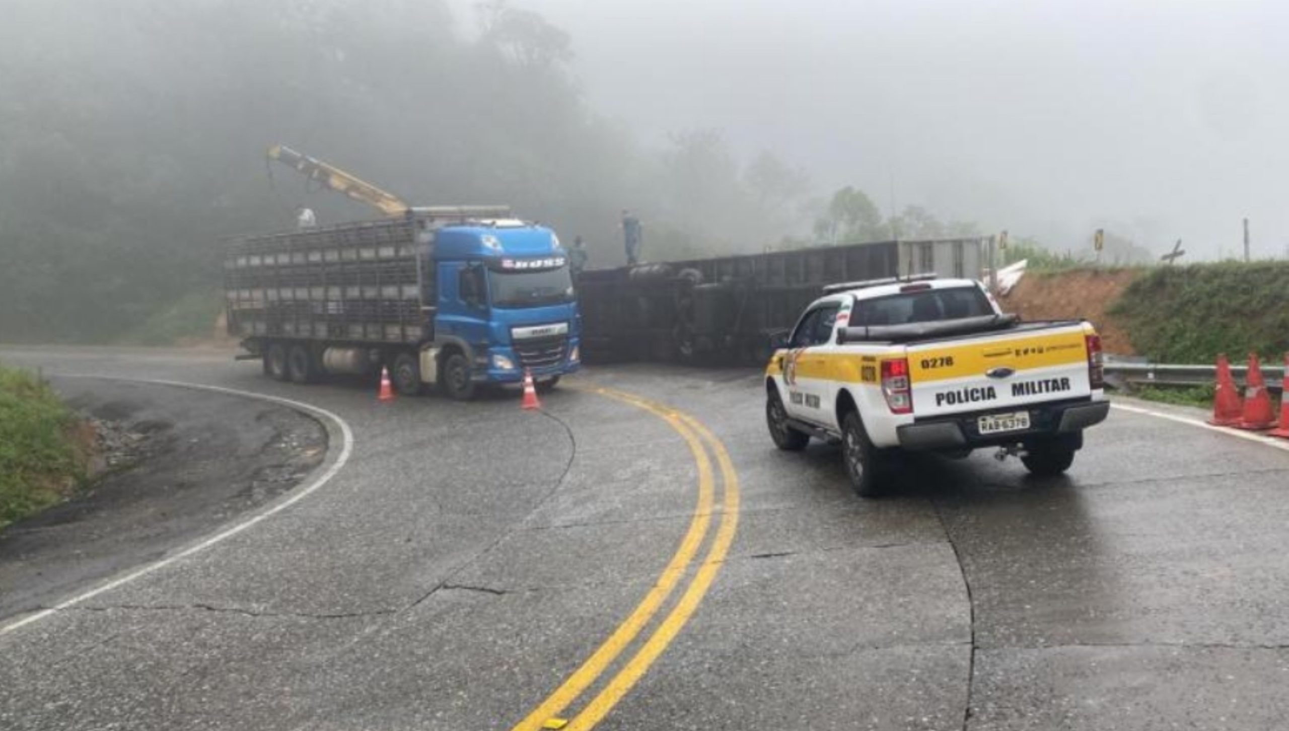 Devido ao tombamento de um caminhão VOLVO/FH na madrugada desta quarta-feira (04), por volta das 00h30, na SC-418, Serra Dona Francisca, a rodovia foi interditada por tempo indeterminado, partir das 11 a horas. Segundo informações do sargento Indalecio Schlickmann, da Polícia Militar Rodoviária (PMRV), a Serra Dona Francisca permanece interditada na tarde desta quarta- feira (04).
