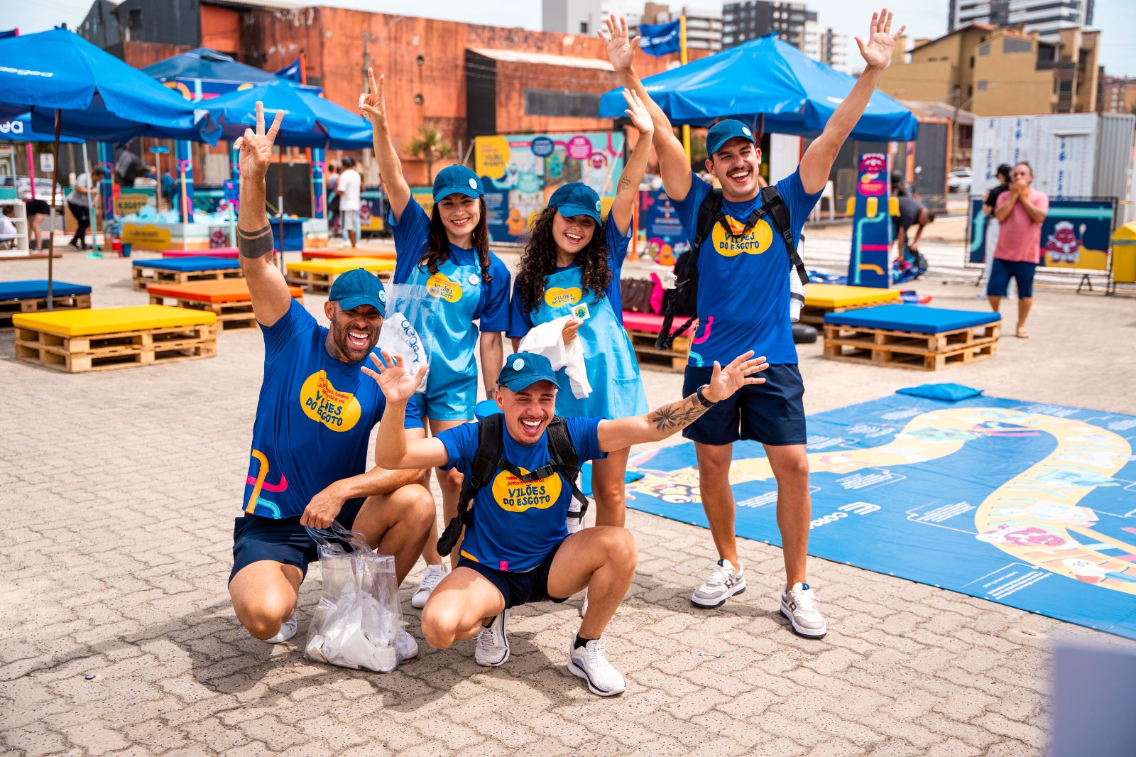 Para celebrar a participação, os “heróis” recebem brindes variados, bolas, chaveiros, brinquedos de praia e tatuagens educativas, que funcionam como selos simbólicos de cidadãos conscientes que combatem os vilões do esgoto e cuidam da água.