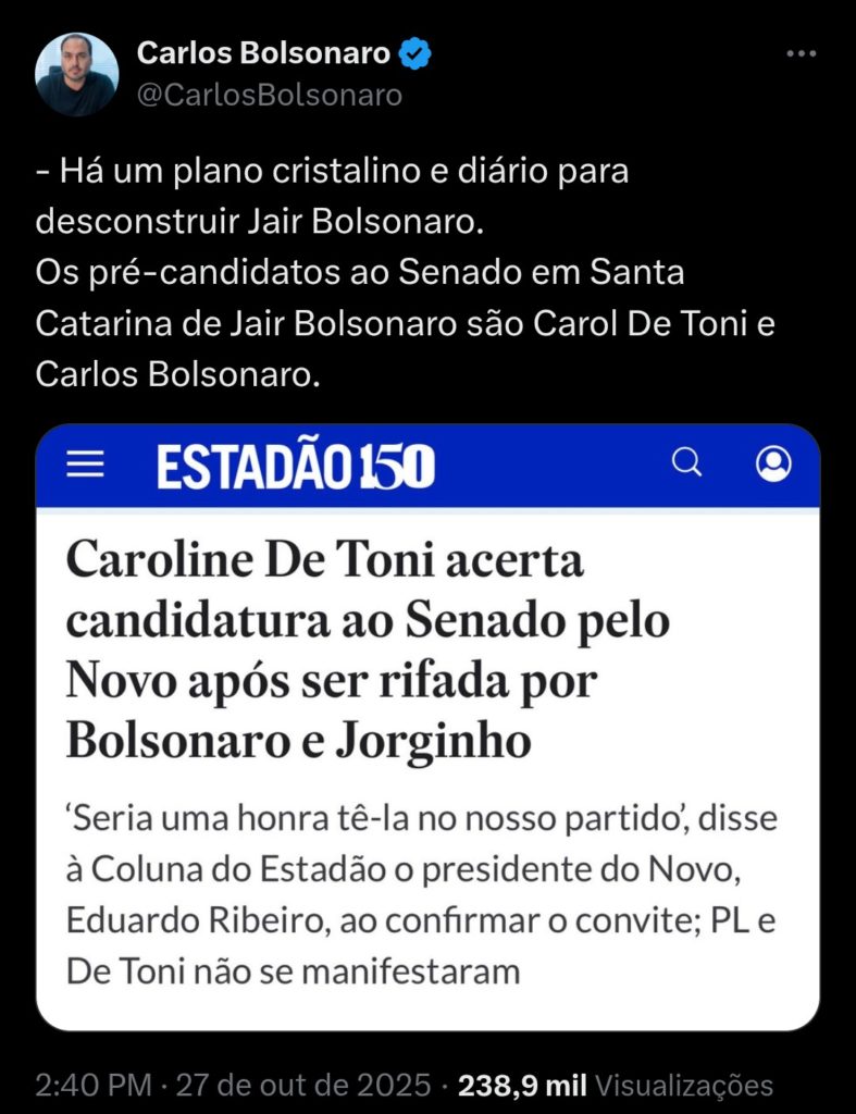 A pré-candidatura de Carlos Bolsonaro ao Senado por Santa Catarina, confirmada por ele mesmo, vem gerando grande repercussão, especialmente por ele ser vereador no Rio de Janeiro e não ter ligação direta com o estado