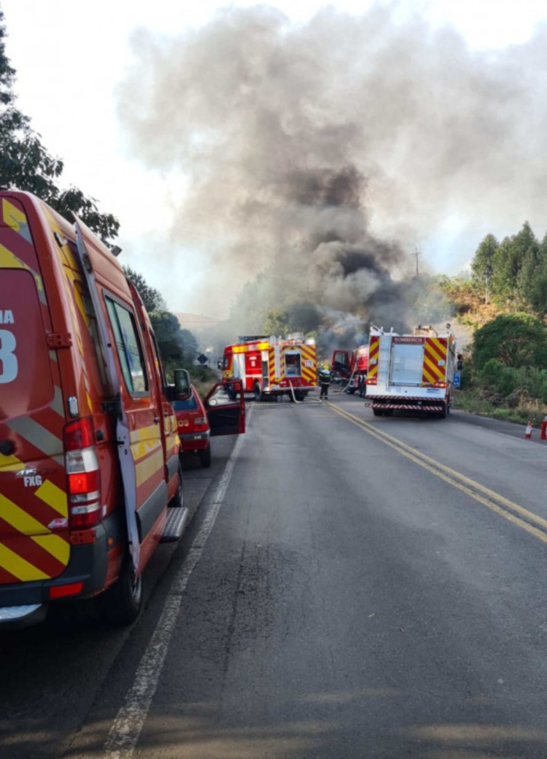 Houve uma microexplosão no local, o Corpo de Bombeiros está fazendo o combate das chamas que já se espalharam pela vegetação. Estão sendo utilizados quatro caminhões tanque. O trânsito segue bloqueado nos dois sentidos, somente viaturas e ambulâncias tem passagem autorizada no local.