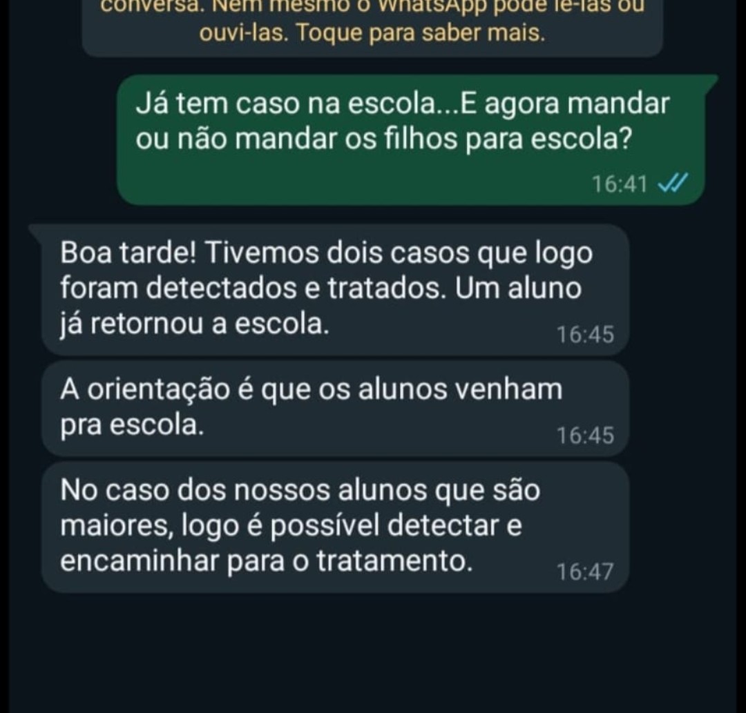 Um aluno inclusive, já teria retornado a escola. A orientação da direção, segundo um print que recebemos, é de que os alunos frequentem a escola.