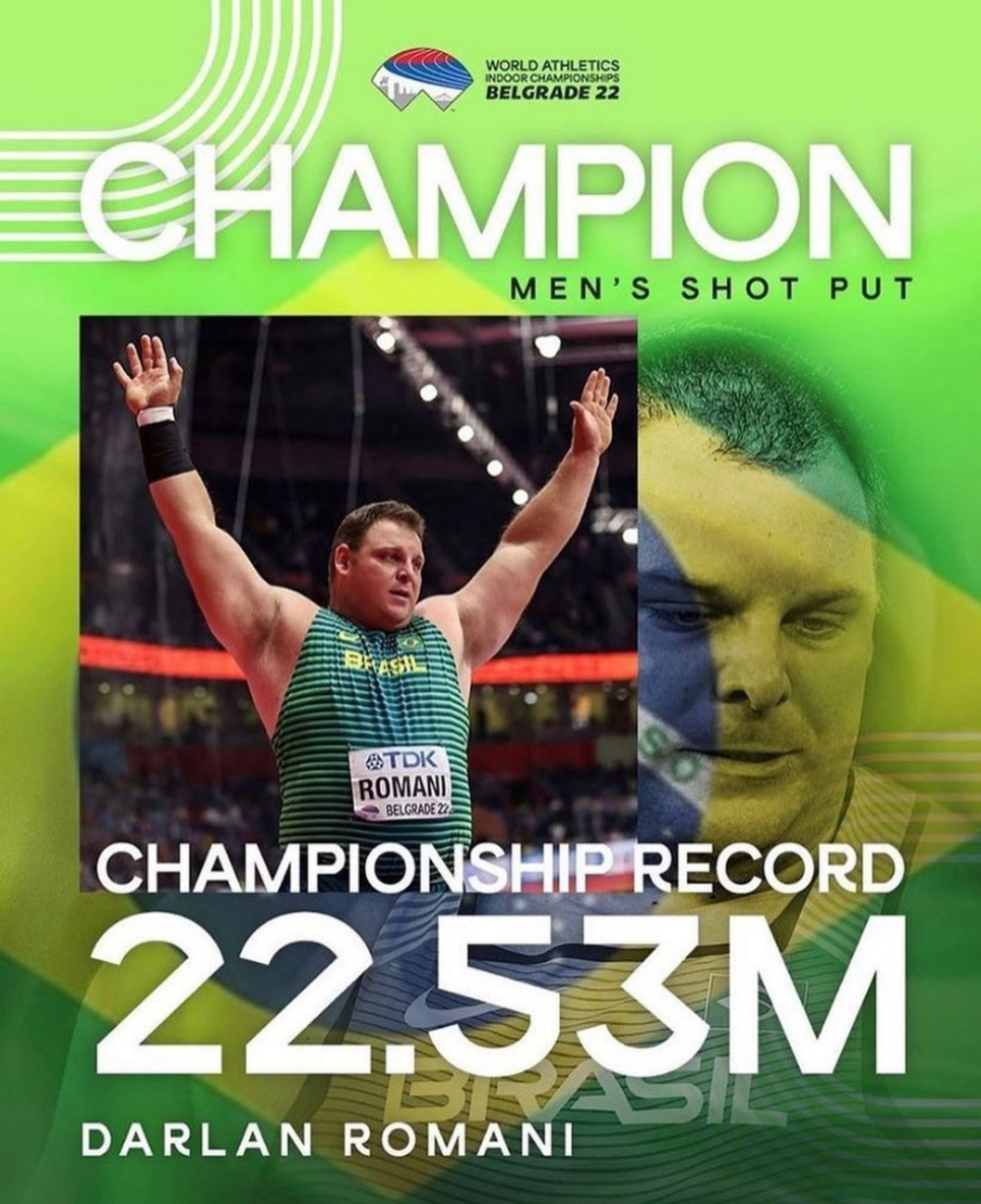 O catarinense de Concórdia, Darlan Romani, fez história nesse sábado, dia 19, ao conquistar o título mundial indoor da prova de arremesso de peso no Campeonato Mundial Indoor de Atletismo, que é disputado na Stark Arena, em Belgrado (Sérvia). Para alcançar este feito, o atleta de 30 anos atingiu a marca de 22,53 metros (na terceira das seis tentativas da disputa), quebrando o recorde sul-americano e se tornando o primeiro atleta do Brasil campeão mundial indoor no arremesso do peso.