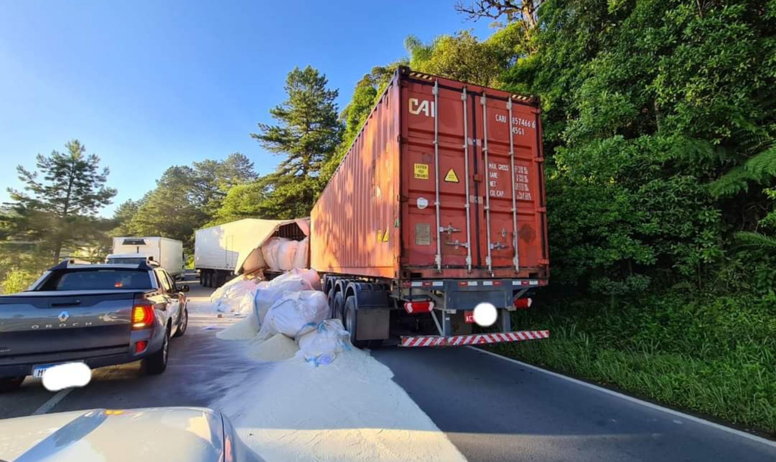 Parte da carga se espalhou pela pista e será necessário a retirada da carga, assim como a interrupção do trânsito para remoção dos veículos. A previsão é que agora, a partir das 11 horas o trânsito comece melhorar.