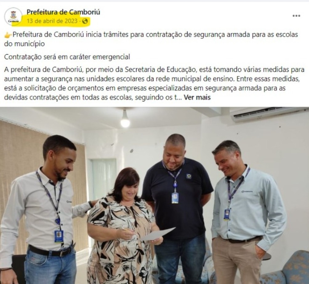 Em abril de 2023, a Prefeitura de Camboriú anunciou que estava tomando providências para a contratação de segurança armada nas escolas municipais. A ideia era que essa contratação ocorresse em caráter emergencial, dada a urgência da situação. A Secretaria de Educação Maria Alice, na época, informou que diversas medidas estavam sendo adotadas, incluindo a solicitação de orçamentos junto a empresas especializadas em segurança armada.