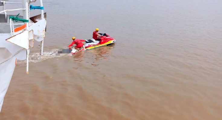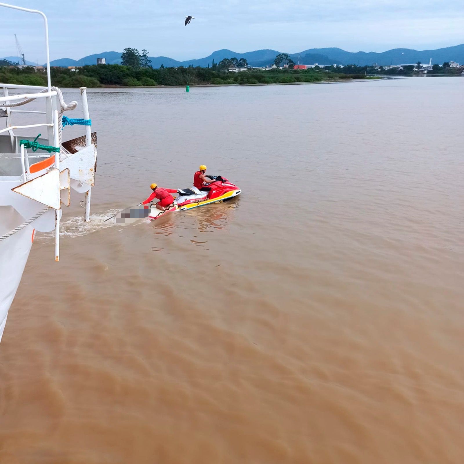 Ao chegar no local a guarnição constatou que tratava-se de um corpo masculino, que estava preso entre suas embarcações. Foi acionado a moto náutica de Itajaí para a retirada do mesmo até o estaleiro.