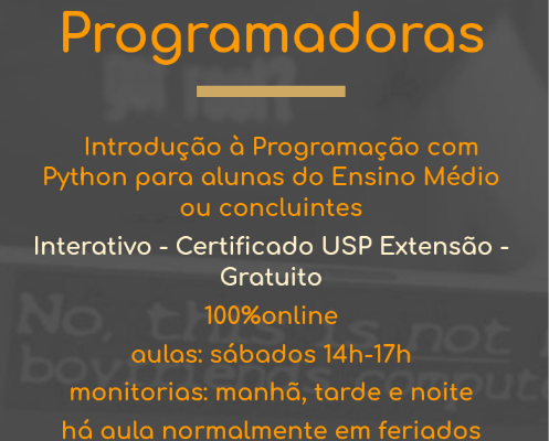 Quem já concluiu ou está cursando o ensino médio e se identifica com o genêro feminino ou não-binário pode participar de uma iniciativa totalmente online e gratuita da USP que ensina programação. É o curso Meninas Programadoras: introdução à programação com Python para alunas do ensino médio ou concluintes, que está com inscrições abertas até 24 de março. As aulas acontecem sempre aos sábados, das 14 às 17 horas, começando em 30 de março e terminando em 27 de abril.