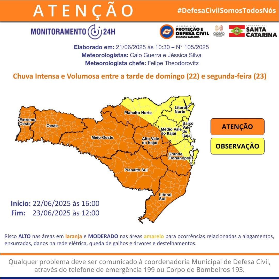 A Defesa Civil de Santa Catarina emitiu um alerta para possibilidade de chuva e frio intenso, a partir da tarde de domingo (22).