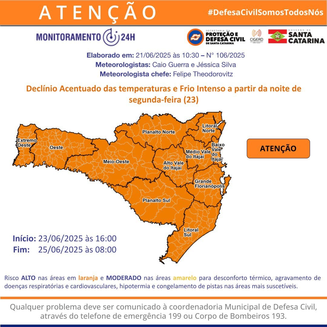 A Defesa Civil de Santa Catarina emitiu um alerta para possibilidade de chuva e frio intenso, a partir da tarde de domingo (22).