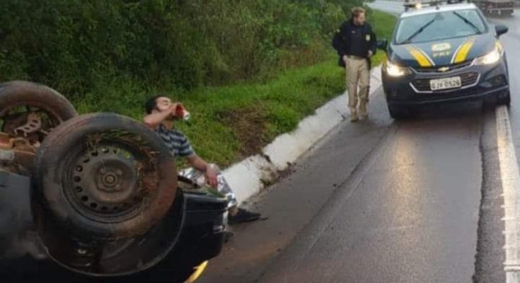 Bebado, o motorista capotou veículo e tomou cerveja no acidente em Xanxere/SC.