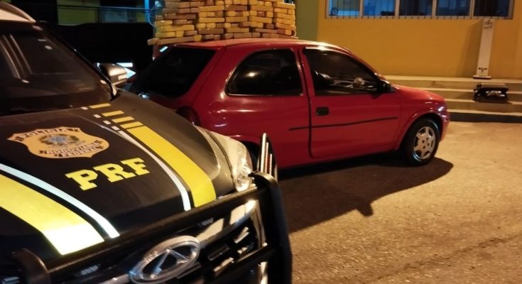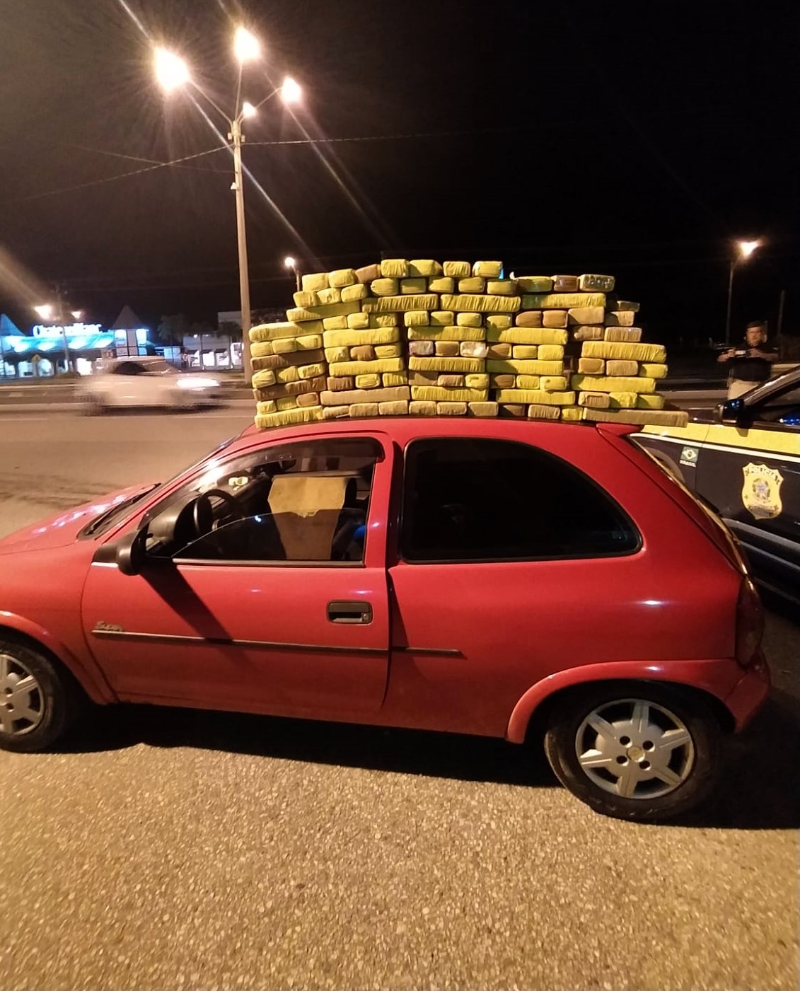 Após troca de informações com a PM, os agentes localizaram o automóvel, placas de Porto Alegre/RS, suspeito de transportar drogas. No porta-malas e banco traseiro, foram encontrados diversos tabletes do entorpecente.