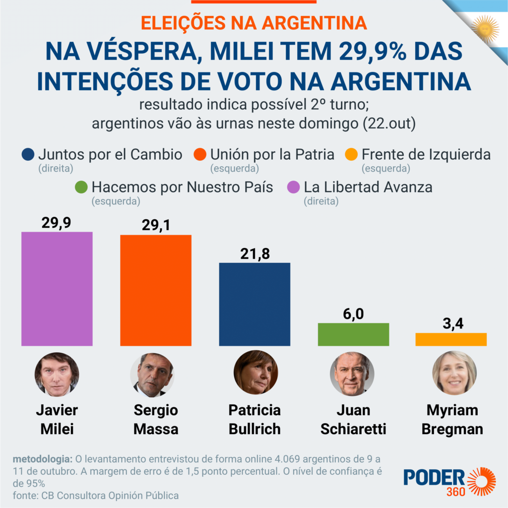 No levantamento feito pela CB Consultora, Milei, que representa a coalizão La Libertad Avanza, tem 29,9% das intenções de voto. Está tecnicamente empatado com Massa, com 29,1%.