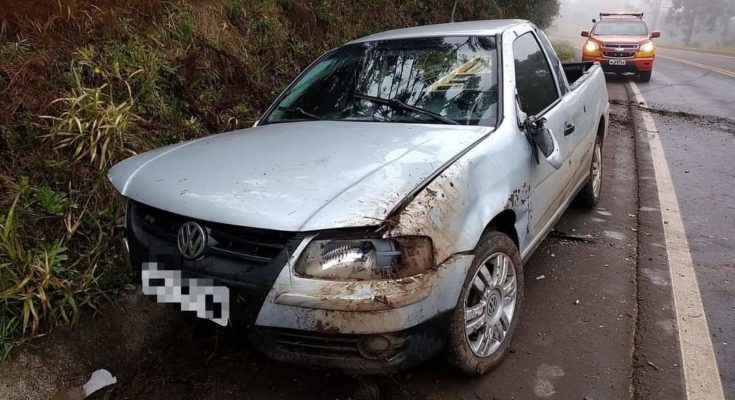 No local, foi encontrado um veículo Saveiro, placas de Fraiburgo-SC, conduzido por mulher de 37 anos, que se encontrava fora do veículo acidentado, consciente, orientada e queixando-se de dores no membro Inferior Direito.