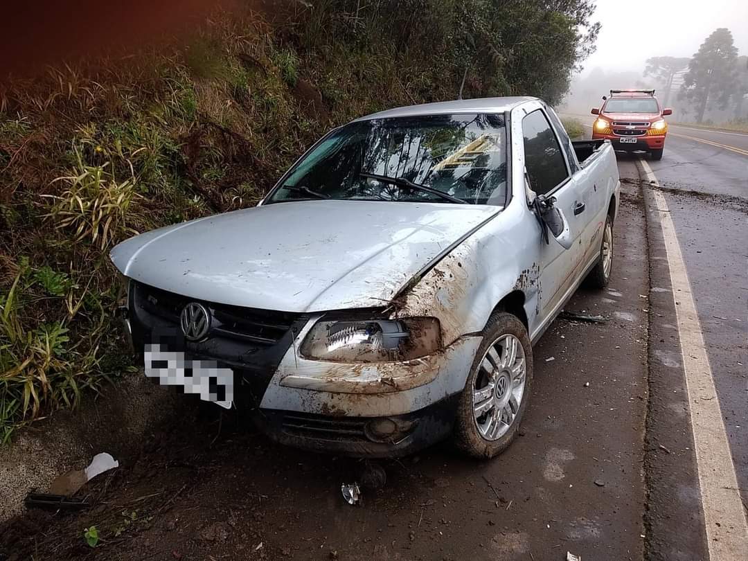 No local, foi encontrado um veículo Saveiro, placas de Fraiburgo-SC, conduzido por mulher de 37 anos, que se encontrava fora do veículo acidentado, consciente, orientada e queixando-se de dores no membro Inferior Direito.