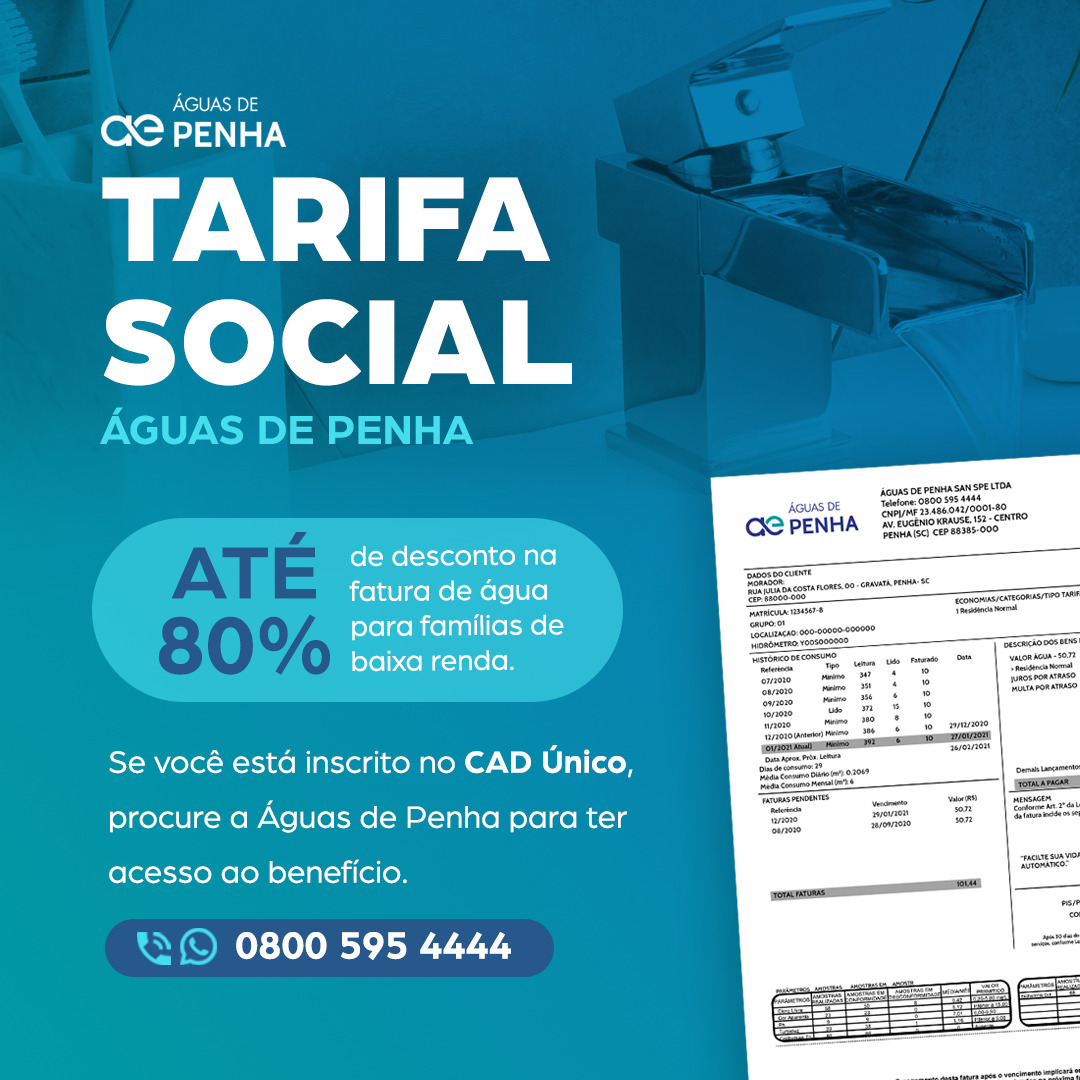 A Tarifa Social da Águas de Penha é um benefício concedido a moradores de baixa renda, permitindo com que as famílias cheguem a pagar até um quarto do valor total da tarifa. Para ter direito ao benefício, é necessário fazer um cadastro direto na empresa e seguir algumas diretrizes, como fazer parte do cadastro único organizado pelo CRAS (Centro de Referência da Assistência Social).