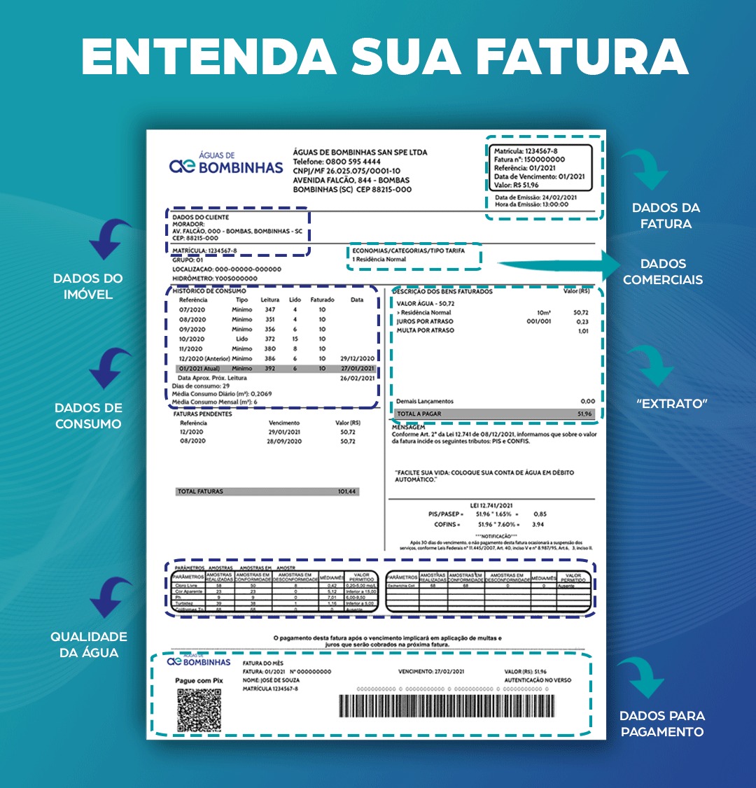 Você sabia que todas as informações necessárias sobre a sua conta, estão em sua fatura? Todos os meses a Águas de Bombinhas te atualiza com dados importantes como o consumo mensal, informações sobre o imóvel, as formas de pagamento e extrato da conta. Quer aprender mais? Confira abaixo cada tópico da fatura: