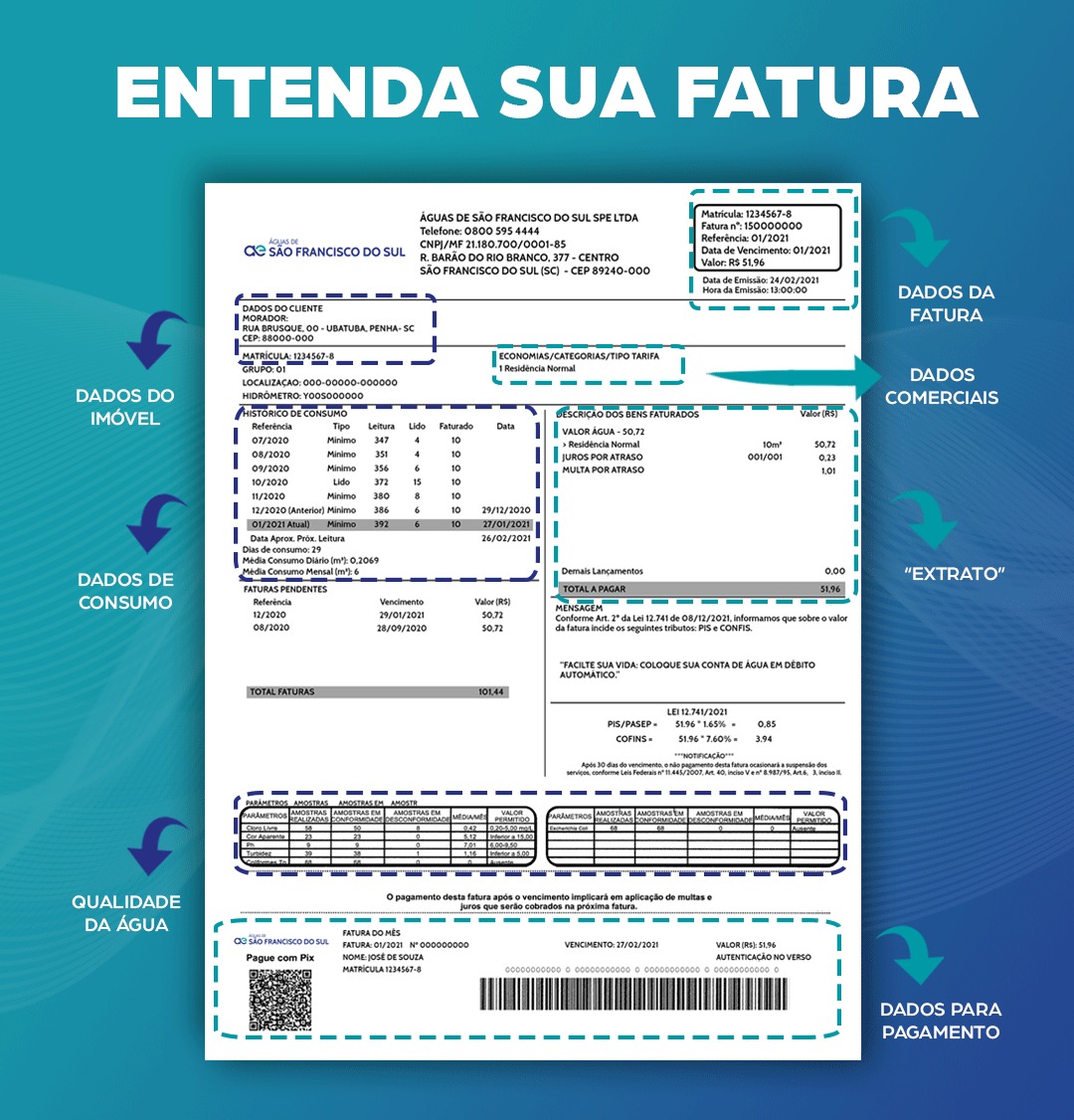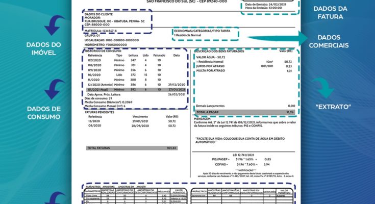 • Extrato: este espaço contempla a descrição do faturamento do imóvel e apresenta dados relacionados aos valores, como possíveis juros, multas, metragem cúbica consumida, etc.