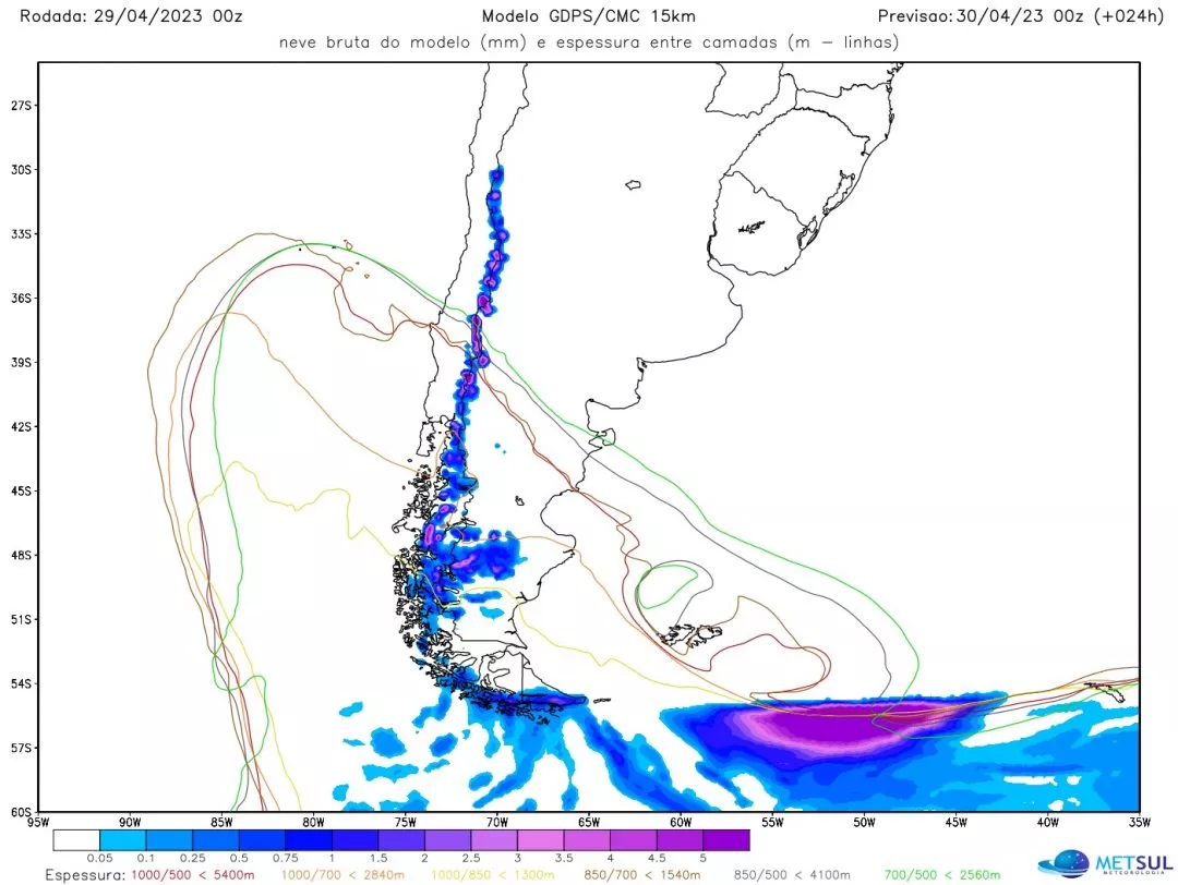 Chuvas fortes e nevascas também são esperadas neste sábado no Sul e na costa da província patagônica de Santa Cruz. Um sistema de baixa pressão irá interagir com ar mais frio, gerando chuva e neve na região.