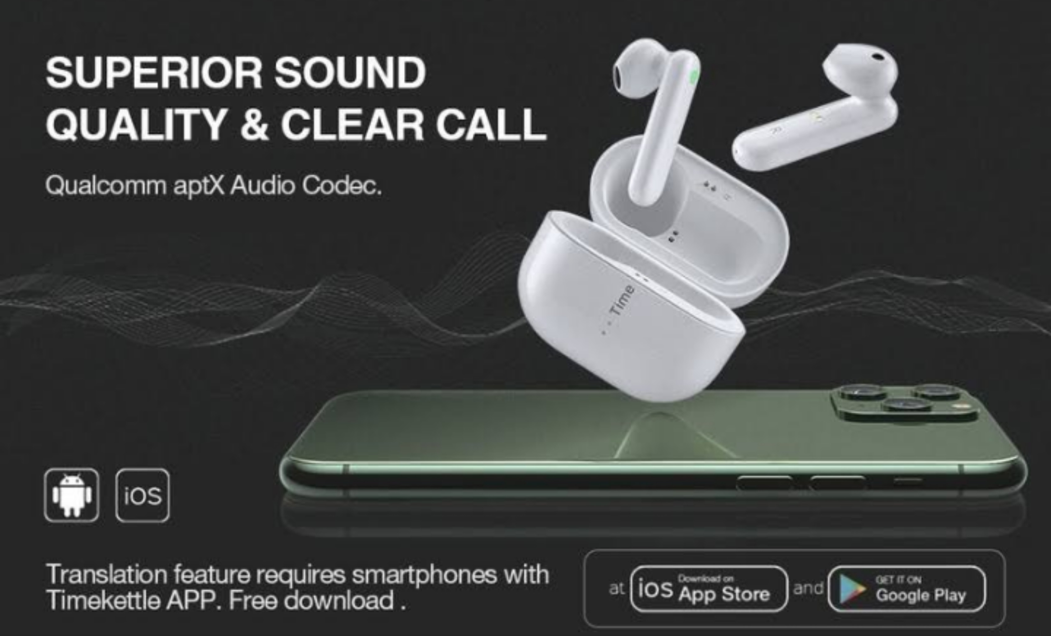 Esse fone de ouvido, chamado de Timekettle WT2 Edge, é um modelo sem fio, similar aos AirPods, da marca Apple.
