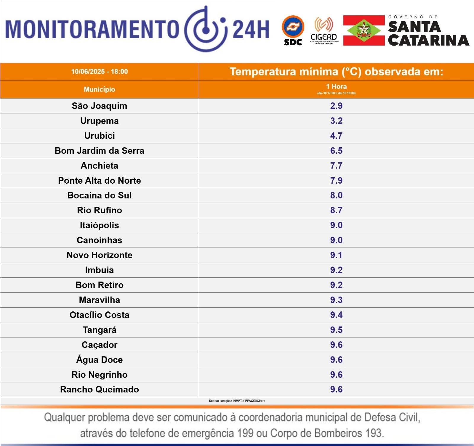 Enquanto isso, no litoral catarinense, as mínimas ficam um pouco mais amenas, entre 10 e 13°C. Apesar do frio intenso das manhãs, a previsão é de que o sol brilhe durante o dia em todas as regiões, proporcionando uma leve elevação nas temperaturas à tarde. As máximas variam de 15 a 17°C nas regiões do Grande Oeste, Planaltos, Grande Florianópolis Serrana e Alto Vale do Itajaí. No litoral, as temperaturas podem alcançar entre 17 e 20°C, enquanto na Serra permanecem em torno dos 10°C.