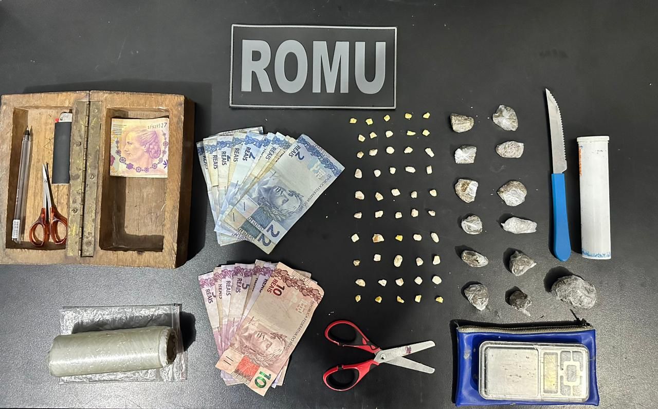 O masculino de 32 anos, não notou a presença da guarnição quando entregou o dinheiro e pegou um pacote contendo duas pedras análoga ao crack e permaneceu na calçada, obedecendo a ordem da guarnição. O outro homem de 34 anos, que entregou a droga, foi realizada a busca pessoal e foi localizado 48 pedras semelhante ao crack dentro de um pote plástico, 13 tabletes de análoga à maconha, R$113,00 reais em espécie, 100 pesos argentinos e material para comercialização de droga, balança, faca, tesoura e plástico filme.