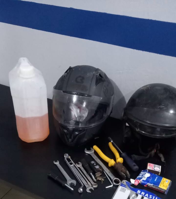 Em posse dos abordados, foram localizadas várias ferramentas e uma placa de outra motocicleta, que também consta com registro de furto/roubo.